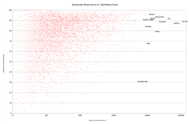[Click for full size. Showing overall user review score vs. total review count for all games on Steam. There is at least some general correlation between quality and popularity. X-axis is logarithmic.]