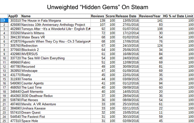 There are also various ways you could decide what a Hidden Gem is exactly. In my system above, since it's based on the weighted score, a game with 95% positive over 150 reviews will still be considered "better" than a game with 95% positive over 100 reviews. Only after 150/yr does it start trending down.