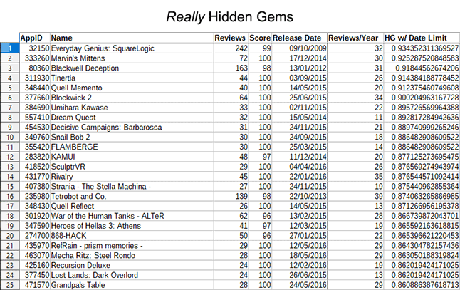 There's a lot more investigation that could be done here. In a more complete Hidden Gem finding system, you'd probably want to be able to view a list per genre, per tag, or based off what else you've played. That way you could view the complete list if you wanted to explore whole new genres you might like, but you could also easily find little-known games in your favourite genre.