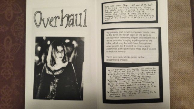In her handwritten zine notes, for instance, she says “the second edition of Monsterhearts contains a lot more focus on queerness and queer shame because the game has slowly revealed to me how that was always already central.” To develop is a game is, often as not, to set events in motion that you eventually lose control over. Emergent themes will blossom among your players and reveal to you hidden depths that were hitherto invisible to you as a dev.