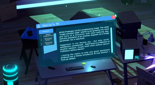 Perhaps one of the game’s most powerful moments comes when you see what a robot emotionally abusing another robot looks like. This is, after all, a game about AI achieving sapience. The very old theme of “how does a robot handle complex emotions?” is present, of course, but Rumu wisely sticks to exploring two specific emotions: loneliness and grief. Strangely, “love” doesn’t quite make it as a theme. If there’s one thing about the game that doesn’t quite work, it’s the way the climax is resolved by attempting to define love--in so doing, we strayed into rather pat, Hallmark card territory. But it’s more than made up for by the otherwise tight focus on those other two emotions and the novel way they’re handled.