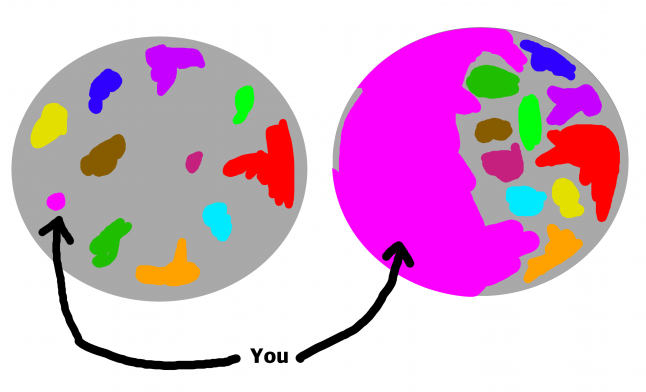 At the start of the game, you spawn with 0.66% of the playfield. If there are 10 other bots, then there is 99.34% space for them to occupy. If you own 50% of the arena and there are still 10 bots, then they are in the other 50%, a much more concentrated area. This makes it harder to venture out of your territory without bumping into someone else.
