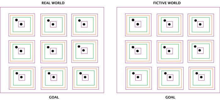Each time we manage to solve the conflicting systems by cognitively doing a merging to make the story and the game become united. What we do when we merge is that we learn how to resolve a conflict as to then start the battle all over again in a new project - like a Hero's Journey but set in the reality of game design. Unaware of the profoundly rooted conceptions from the opposites we have created between fiction and reality, story and games. A production assigned by genres to be story-based the setting of the “intuitive battleground of systems” to reach the desired goal, system-wise it could be depicted like following from a cognition-based approach to the narrative: