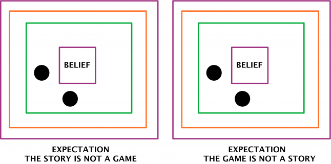 Seen from the image above and imagine that the two opposing worlds (real and fictive) and each system inside each world consists of a belief. The cognitive exercise of an “intuitive battleground” in the real world as to reach the desired goal means that they who are expected (based on beliefs) to construct the narrative linearly in the fictive world needs to intuitively think in terms of systems. And they who are assigned to create the systems of gameplay needs to know how to meet they who are assigned to do the linear work according to the conceptions about the story. It is here our intuition of logic and approach to learning, which decides if we will manage to merge (learn) against the current beliefs and conceptions. Depending on the path to learning, it determines how we discern the signals from the gut feeling when detecting contrasting systems to be logic or illogic due to conceptions from the 19th-century.