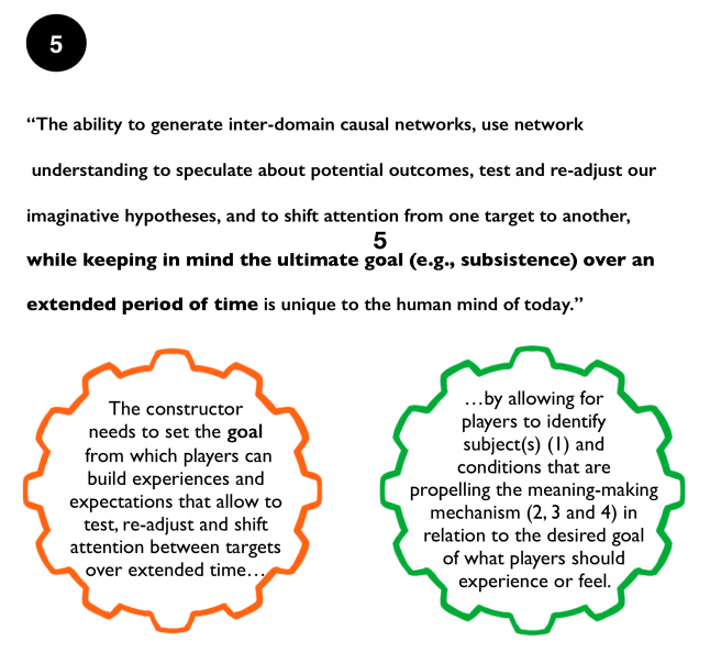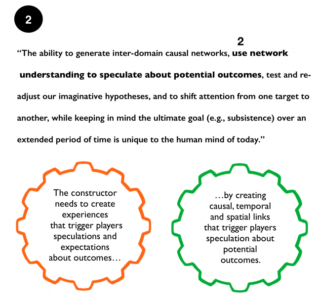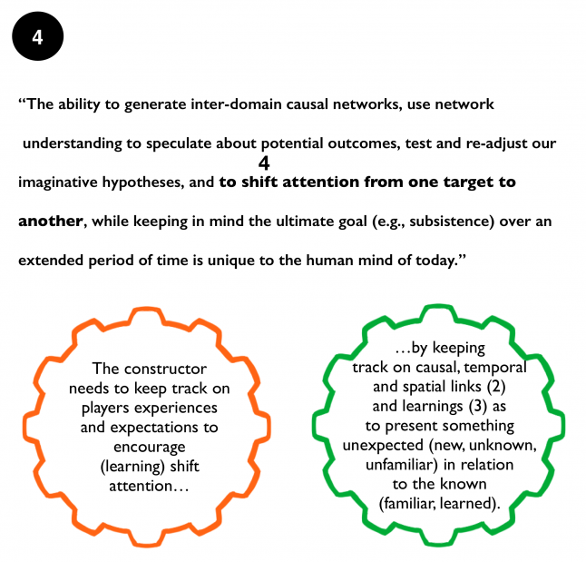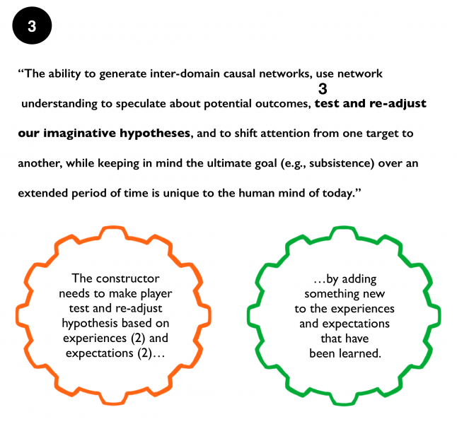 Though the description of how our thinking works is a bit tricky to access as the core cognitive activities are performed on an unconscious level. I will repeat the citation in five steps. At each step, I will point to a specific part of our core cognitive activities and add a description of the operations performed from a narrative constructor’s (designer’s) perspective in the creation of an engaging experience that attends to how our learning and emotions work.