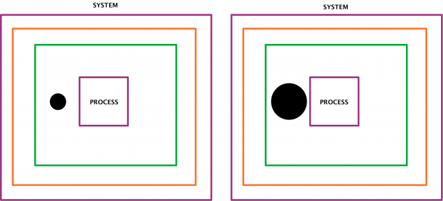 Based on the description above of the premise. Let us say that we identify a subject that is small, from which we take perspective. If the subject should be perceived and conceived as small something needs to be big. When defining something to be small, we have giving meaning to a relation between two contrasting elements, which gives us a condition of two contrasting systems that puts propellors on a process.
