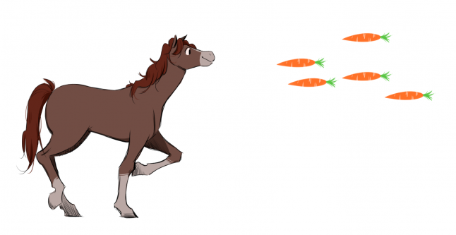 By presenting the carrot before the horse’s senses (touch, hearing, sight, taste, smell) you are triggering the desire to reach the carrot which motivates the horse to move towards the carrot.