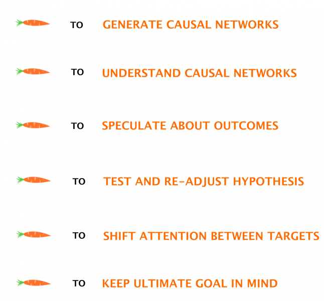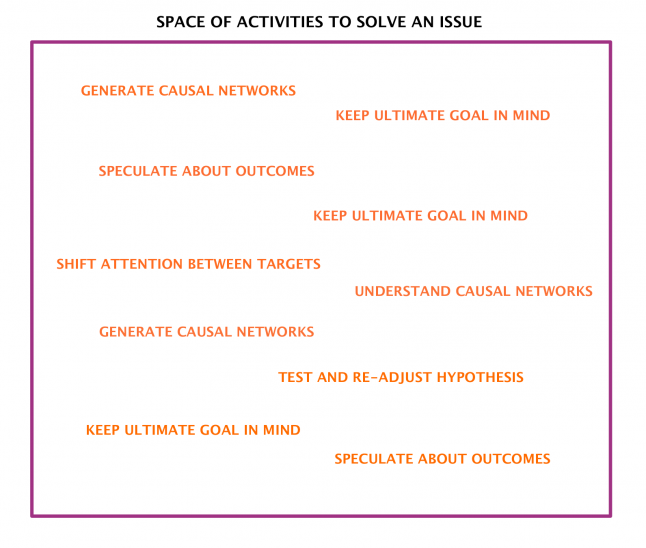 The diagram below can be used to imagine any context where the components of the core cognitive activities are applied. It illustrates how actions are evoked, whether you are solving a crossword puzzle or feeding a gigantic ancient creature in a video game: