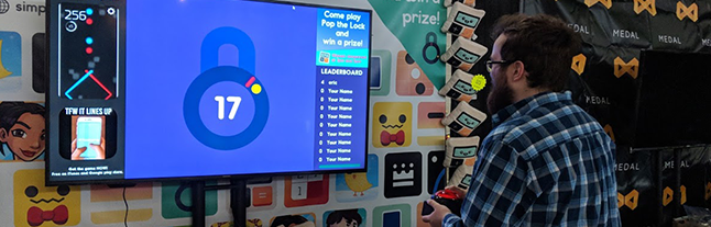 We built a custom version of Pop the Lock and put it on a 65 inch TV screen. Throughout the convention, we kept a high score leaderboard and used those scores to run giveaways for free plushies.