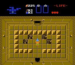 Also in each dungeon is at least one boss, and one of the bosses in each guards a "Triforce piece." The ultimate object of the game is to get eight Triforce pieces, which unlocks the way into the ninth and last dungeon. In there is Ganon, the hardest boss, who guards Princess Zelda, the aim of your quest. Defeating a dungeon's boss also awards Link a heart container, extending his maximum health by one unit. A few heart containers can also be found in secret places in the overworld. So, in a manner somewhat similar to Brogue, player character improvement comes from finding items instead of gaining experience points, and you don't always have to slaughter and slay to get them. But unlike roguelikes in general, Zelda is a real-time, action game. In fact, it's action is pretty sharp. There are enemies (especially the so-called Darknuts and Wizzrobes) that will kill Link pretty easily no matter how strong he's become if his player isn't skilled at attacking and dodging.