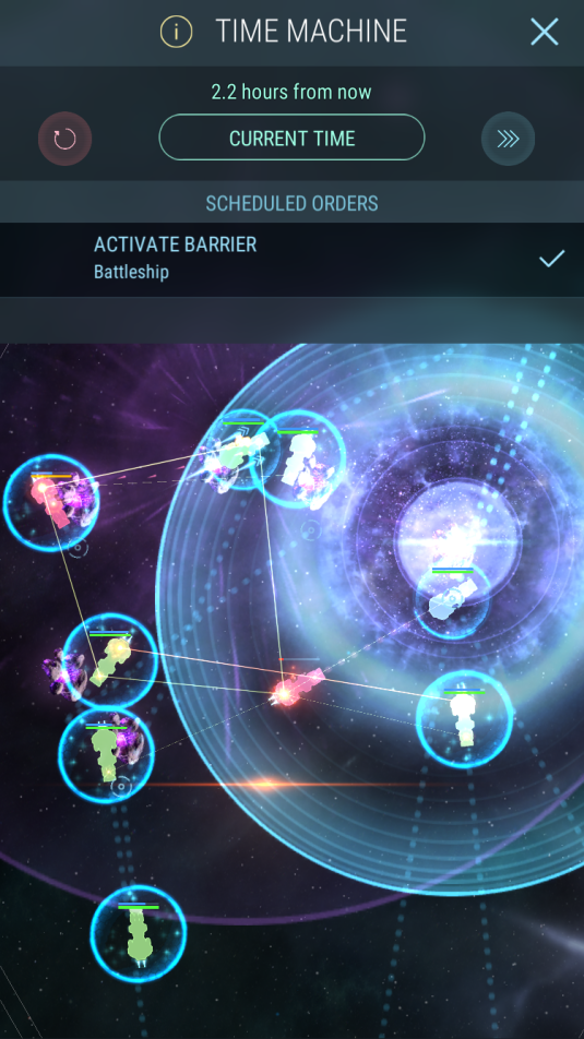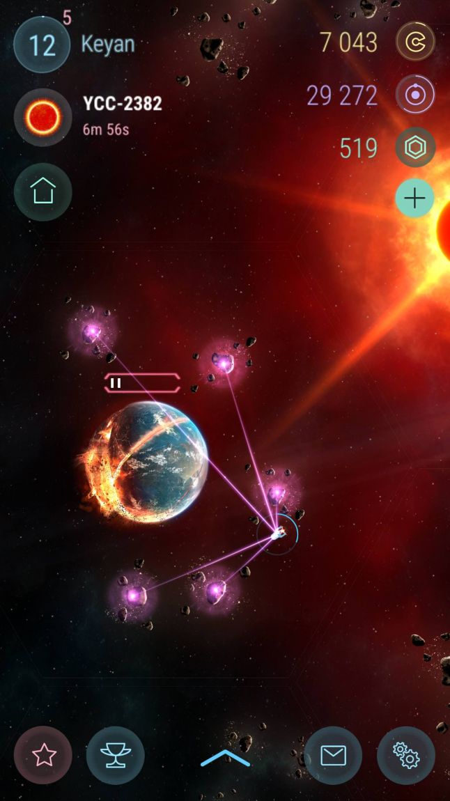 The main 10-minute loop in our game is the Red Star mission. Every day, players send their battleships to procedurally generated star systems that have very short lifetime, contain planets with valuable Artifacts, and must fight the AI ships guarding the planets in order to escape with the loot. Red Stars are open to everyone: most systems will have 2-5 players participating at the same time. These players cannot attack each other, but they can work together to take out the guarding AI ships.