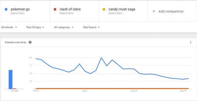 A quick overview of Google Trends data bears this out. As The Outsiders cofounder (and former Ngmoco Sweden chief) Benjamin Cousins noted on Twitter last weekend, Google searches for Pokemon Go have dropped precipitously in the past 30 days, whereas searches for enduring F2P heavyweights like Clash of Clans and Candy Crush Saga remained relatively steady.