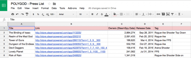 After doing rounds of this for each game, I added them all to the master press list and used the Google Spreadsheet add-on, “remove duplicates” to remove all duplicate press sites, YouTubers and Twitch streamers.