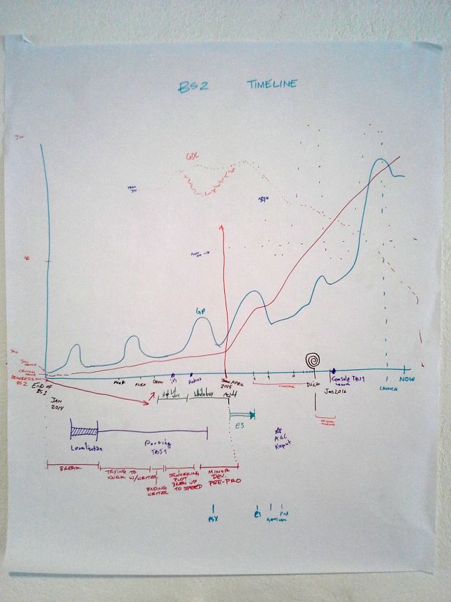 Then, a series of technical projects, including localization and porting, consumed most of John Watson's time for the next year. Alex Thomas, the writer of the first game, decided to set off on his own to work on his own project. We brought Drew McGee on to write the next game, and he and Arnie Jorgensen began preproduction and planning. We had some false starts, but a year later, with E3 2015 looming on the horizon, we started production in earnest. We brought Matthew Rhoades onto the team for technical design work and that E3 showing was our first fully fleshed out vertical slice of the game.