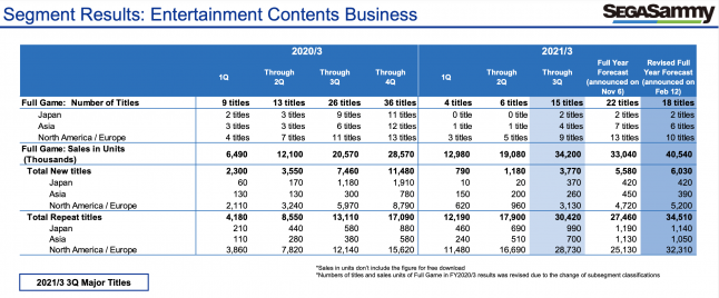 The company also singled out the "strong performances" of new releases including Football Manager 2021, Yakuza: Like a Dragon, and Shin Megami Tensei III Nocturne HD Remaster. Overall, which helped drive overall software sales to 34.2 million units (as shown below) -- compared with 19.3 million units for the same period in the last fiscal year.