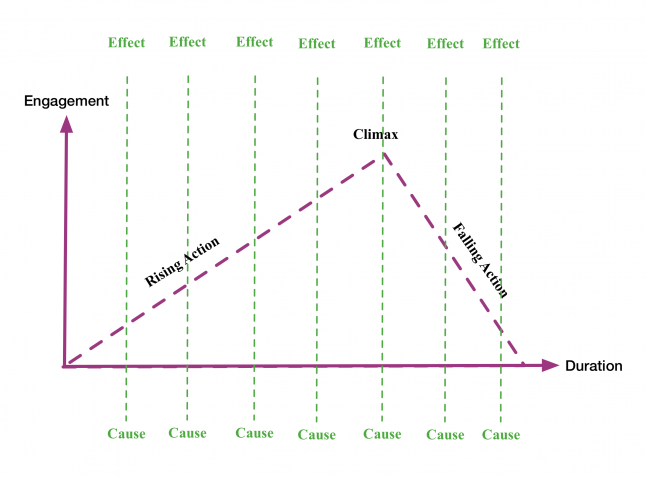 To unveil the core to how you are pacing and balancing plot and style to engage and motivate the receiver's meaning making, I replaced the story structure's standard features with an engagement and duration axis.
