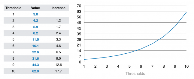 Here, it is the increase between each threshold that follows a linear curve, not the threshold values themselves. In the following example, the value increase for each threshold goes up by 1 for each new threshold.