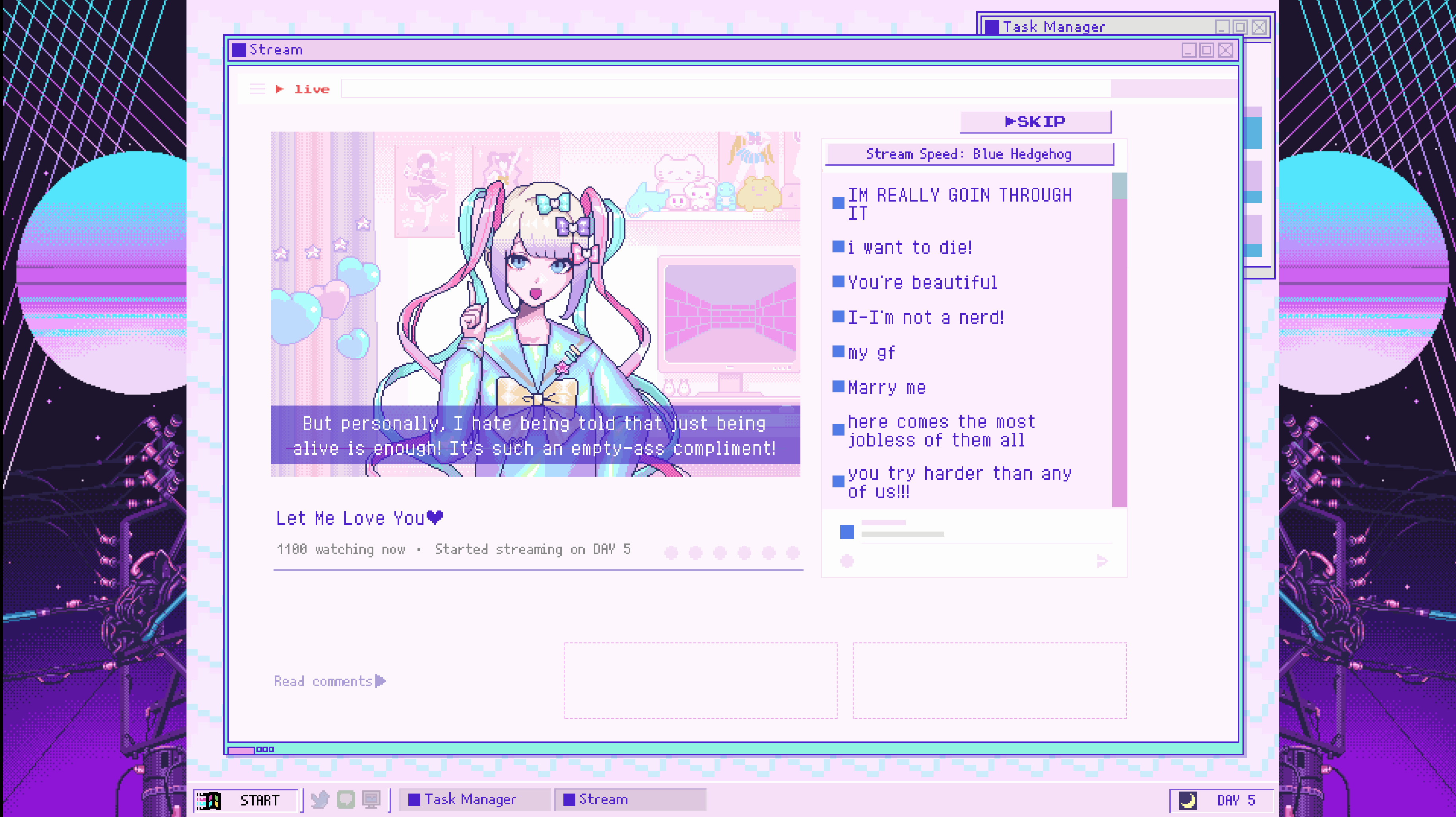 NEEDY STREAMER OVERLOAD is a game that speaks to a specific type of online experience. You play an aspiring streamer trying to “make it” in the competitive attention economy that is internet culture.