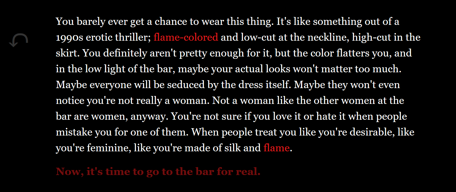 Currently the only entry in the “queer traumatic/erotic vent game jam” is black stars, clear liquor, a branching twine story.