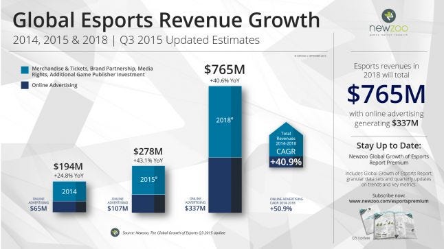 Revenue generated by eSports games, events and advertising is growing faster than expected, reports market research firm Newzoo, and is now estimated to reach $765 million globally by 2018.