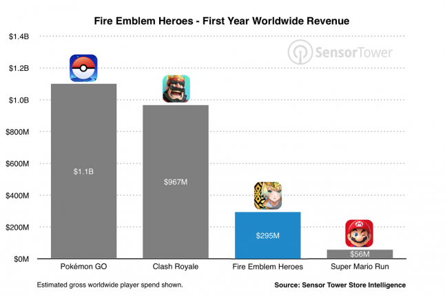 As reported by analytics outfit Sensor Tower, Fire Emblem Heroes earned an estimated $295 million in worldwide player spend during its first year on digital shelves.