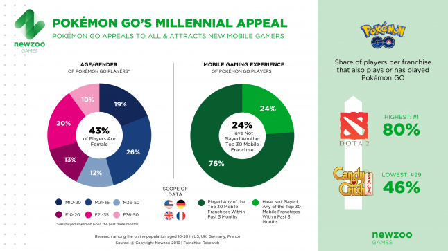 According to a blog post from Newzoo, which has been doing some data analysis of Niantic’s hit mobile game, 24 percent of Pokemon Go players had not, in the last three months, played any of the 30 other major mobile franchises Newzoo tracked. And eight percent of those players (6.6 million total) hadn’t played any of the 100 major game franchises (that extended across mobile, console, and PC) Newzoo targeted in the last three months.