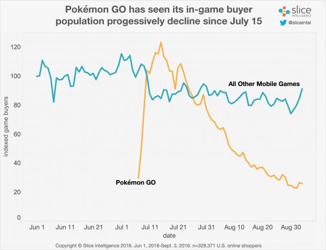 Last Friday market analysis firm Slice Intelligence reported that the number of Pokemon Go players who are making in-game purchases has declined roughly 79 percent since peaking on July 15th, roughly a week after it launched in North America and became a pop culture phenomenon.