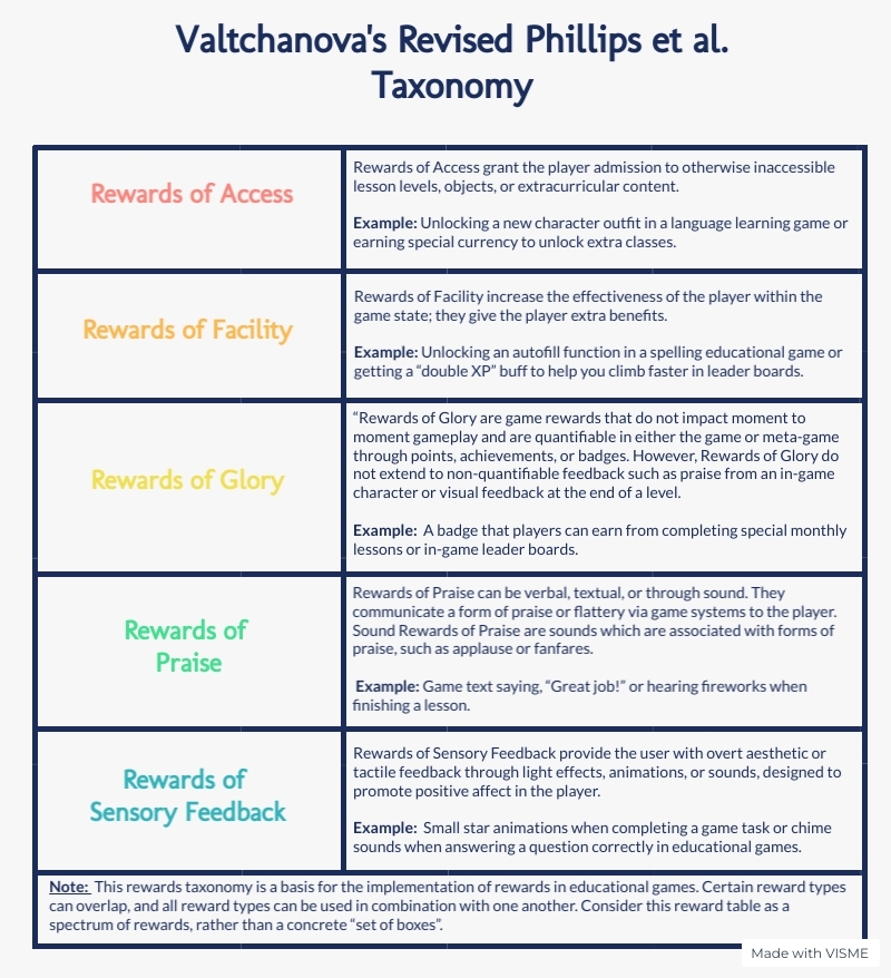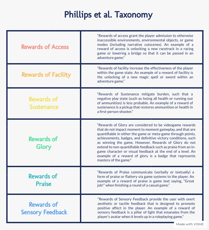 The Phillips et al. taxonomy was created as an adapted version of the Hallford and Hallford taxonomy, to test if such a system can work for a variety of entertainment games. They discovered that the taxonomy can be versatile, and made changes to it by adding two new types of rewards - Rewards of Praise and Rewards of Sensory Feedback. The system with its original definitions is pictured below.