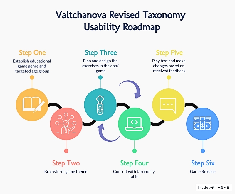 Step five is play testing and implementing changes based on feedback. The taxonomy can also be used as a reference during this step, especially if negative feedback is received on a certain type of reward or exercise.