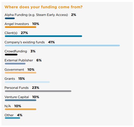 As in years past, the most popular response remains the company’s existing funds (41 percent); but this year it seems that investment from clients has crept up to become the second most popular source of AR/VR/MR funding, with 27 percent of respondents saying they’re funded by a client or clients.