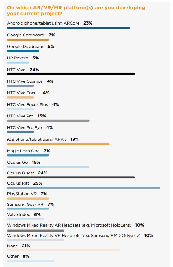 When we asked survey respondents which AR/VR/MR platform(s) they’re currently developing for, 29 percent said the Oculus Rift, 24 percent said the Oculus Quest, and 24 percent said the HTC Vive.