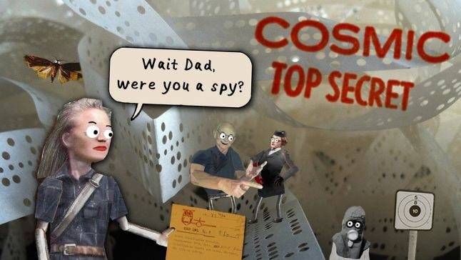 Cosmic Top Secret tells a papercraft story of Cold War secrets and family connections, taking the player on an autobiographical journey through the stories of a developer's parents. The player, as a paper person named T, will follow in their parents' military footsteps, learning more about their history as members of Danish intelligence while also exploring their connections with their daughter.