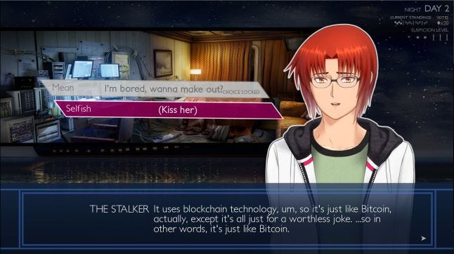 There's a lot more code involved than a lot of people assume, though. The game has a unique choice system—as far as I'm aware, no other videogame has anything like this—involving dialogue options with variable timing, which was challenging to implement, but even more challenging to write for!
