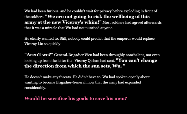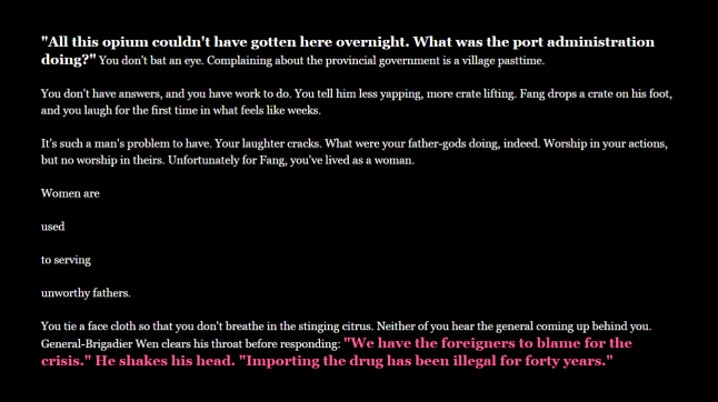 I give the player absolute narrative control in a moment in part three where I ask the player to type in their opinion of the British Empire. The game acknowledges and canonizes the player’s response on the next screen. I took a risk, since the player could still force Mulan to state: “May the sun never set on the British Empire.” However, it would be more powerful if the player chose to condemn the empire on their own terms. My player has always been my partner-in-crime, and that input screen is my ultimate expression of trust.