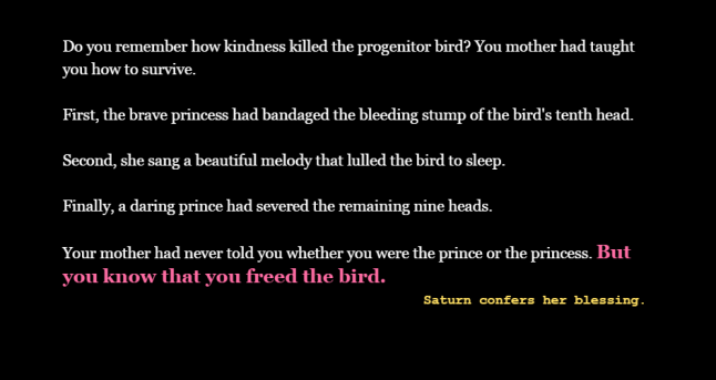 I see my characters as tools, and not purely extensions of my ego. That doesn’t mean that they’re objective or bias-free (Mulan is a passive-aggressive complainer). It just means that they’re props that I use to create the narrative. The character of Hua Mulan is not a person, the player is a person. As a designer, I know that I have trapped my player into terrible situations. That’s why I always use the game’s narrative voice to comfort, rather than condemn their choices. I was the one who wrote those choices!