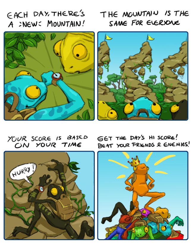 For the daily mountain, our programmer Semih found a way to use the date of the day as a seed for the mountain generator - allowing the game to randomize mountains from Frog Climbers' list of mountains endlessly. In that way the daily mountain feature is entirely automated.