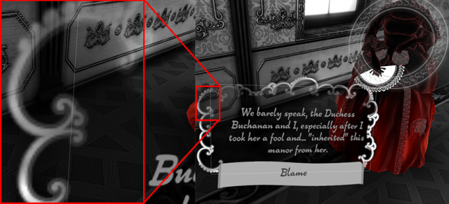 We decided to make a background for texts. That's quite a simple idea but, that enable us to work out the ghosting inside it, we didn't have to worry about either or not the text would appear on a specific part of the scenery. The text had a light color and it was contained inside a dark background that reminded a "rococó bubble speech". We also added a visual effect to make it look more ethereal. That effect is very soft and as it has a transition, it helps in making the ghosting smoother when player looks around.