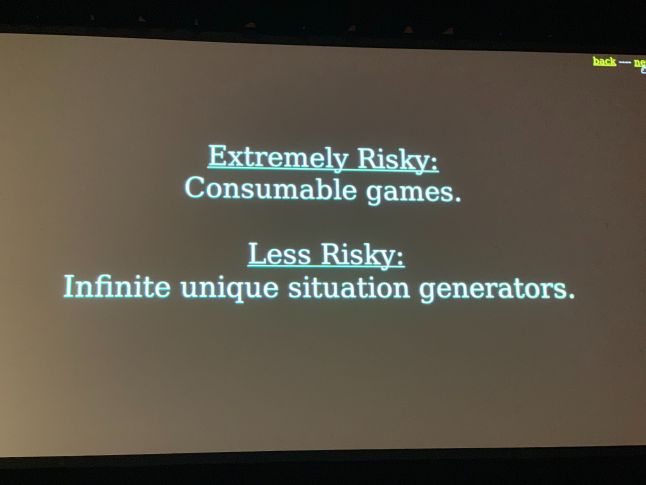 Rohrer’s argument is simple enough that near the end of his talk he summed it up in a slide: “consumable” games players can finish and put aside are more risky than “infinite unique situation generators” like Subnautica and Staxel.