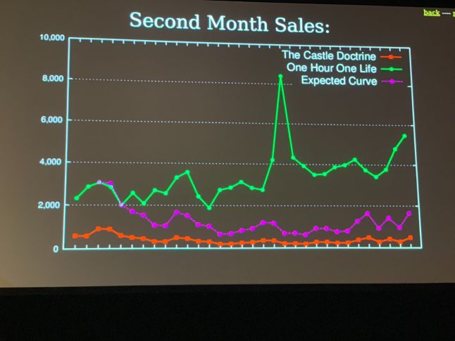Rohrer shows the surprising leap in sales One Hour One Life saw during its second month on the market, relative to both his expectations and sales of The Castle Doctrine four years earlier