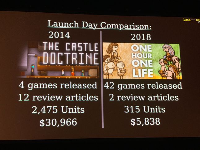 But he does acknowledge that Steam is much more competitive than it was even a few years ago, When The Castle Doctrine released in 2014, it was one of four games that released that day and it was on the “New Releases” chart for almost a week. Come 2018, he released One Hour One Life as one of 42 other games, and it never really found a foothold on the “New Releases” chart.