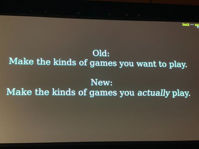 Rohrer encouraged other devs to look to their own game libraries and identify which games you play the most of, for the longest stretches, and then think about making games like that if you want to minimize risk.
