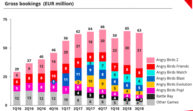 Once again, Rovio’s 2015 release Angry Birds 2 has built on several quarters' worth of increasing gross bookings to give itself a record-breaking quarter. That one game saw a 68 percent year-over-year increase in gross bookings to bring in €30.8 million (~$35.2 million) during the quarter ending September 30.