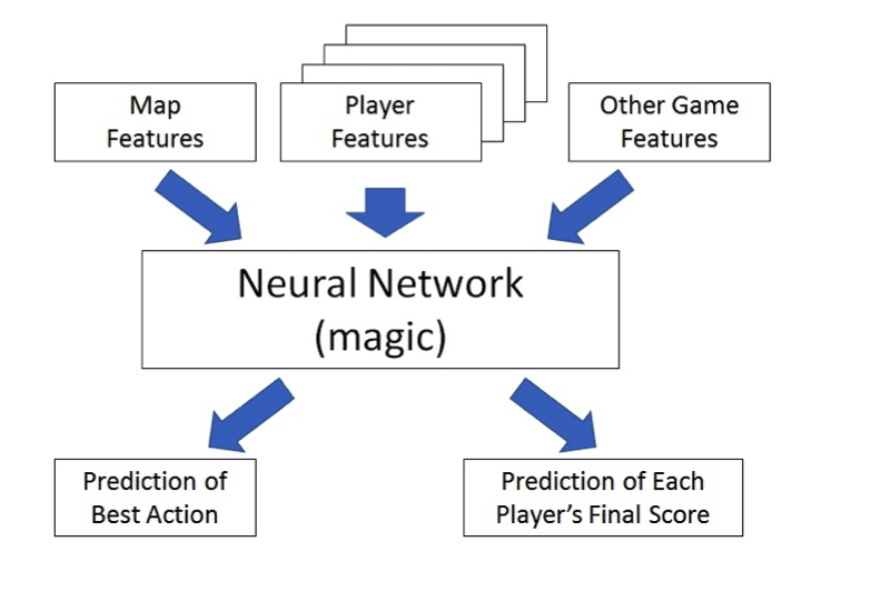 While Terra Mystica takes place on a hex-based map instead of a square grid, a CNN can still be applied to it so that the proximity of players’ buildings can be incorporated, which is a critical part of TM strategy. However, there are several things that make TM a much more complicated game than Go.