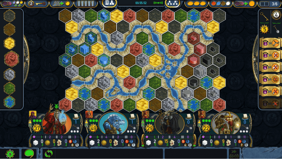 Chaos Magicians, Swarmlings, Darklings, and Dwarves fight it out on the digital version of Terra Mystica. Complexities abound and an AI needs to know how to read the board. Darklings will want to upgrade one of their dwellings to get the town bonus. They should upgrade next to the Dwarves to keep power away from the stronger CM player. The choice of towns could affect the flow of the rest of the game: