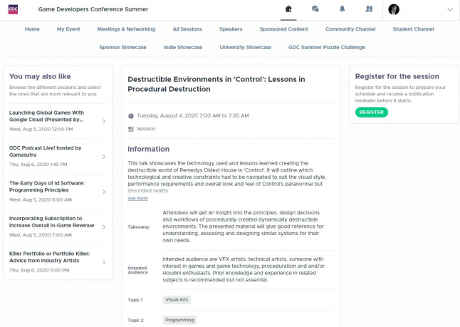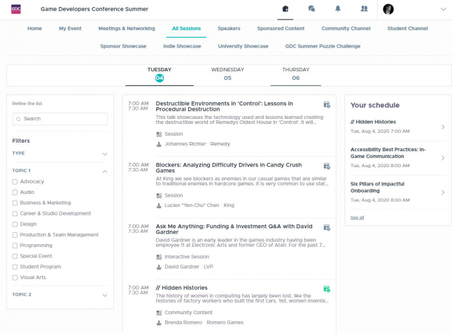 Hey game makers, just a quick update that the online platform Game Developers Conference organizers are using to host next month's all-digital GDC Summer has been updated with full scheduling details for all announced talks!