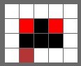 Level 1-1 in the game and its block representation: 3x2 moveable area. 2 Red Skiddies, 4 Empty Blocks, 1 Red Goal. This simple level contains the minimum number of blocks to fully show basic mechanics and allows one to gain all 3 medals.
