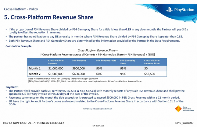Clearly, Sony eventually did find a way to make cross-play work in its favor, and another document along with comments from Epic chief exec Tim Sweeney show precisely how. As the slide below shows, the Japanese company decided to introduce "cross-platform revenue share" that would offset the reduction in revenue lost through cross-play.