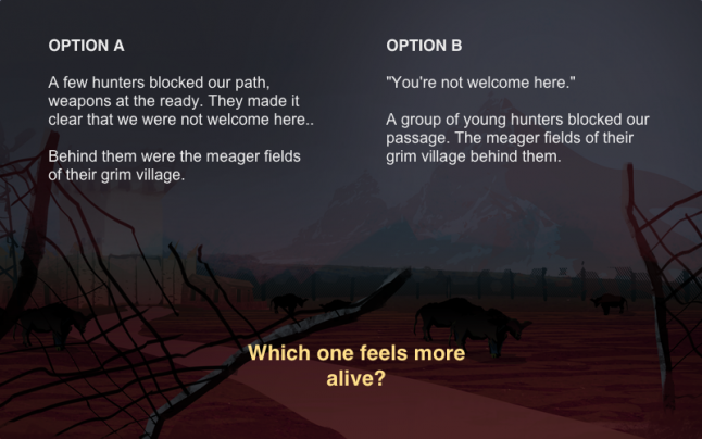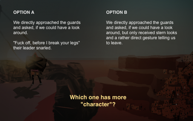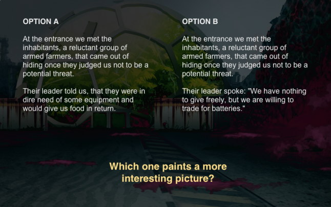 Now this does not mean, that direct speech is always superior. It remains a design decision to pick the style that best fits your game. And for that we need to look not just at the numbers, but also at the emotions behind peoples votes: