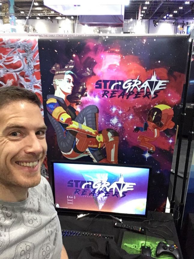 Here’s yours truly next to the little booth space we booked with the wonderful Tentacle Zone. It was perfect for us. We didn’t want to announce anything, but we did need to test the key art, title, and game itself in the real world.