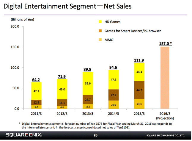 Where did that come from? Strong mobile and browser game performance, online games (including the Japan-only Dragon Quest X, and the globally popular Final Fantasy XIV: A Realm Reborn) and digital download sales of its existing game catalog -- there were "fewer full-length console game titles" as compared to the prior year.